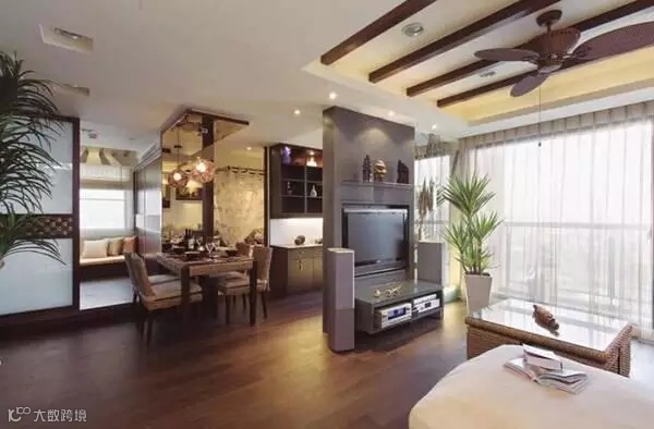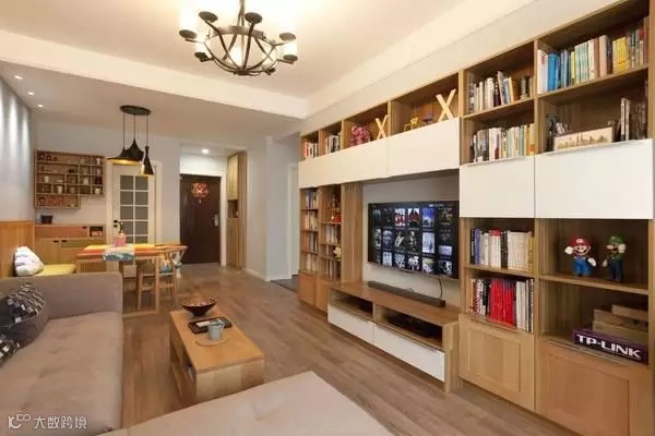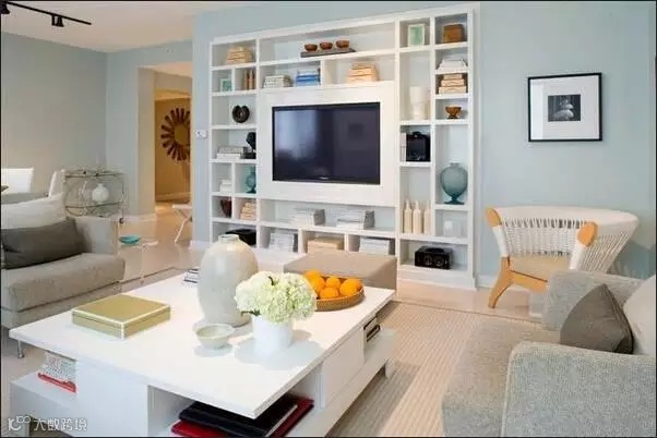 小面积的背景墙很多户型家里电视背景,并不是一整面墙。那只能通过电视柜来增加储物了,柜子颜色最好和背景相搭配。