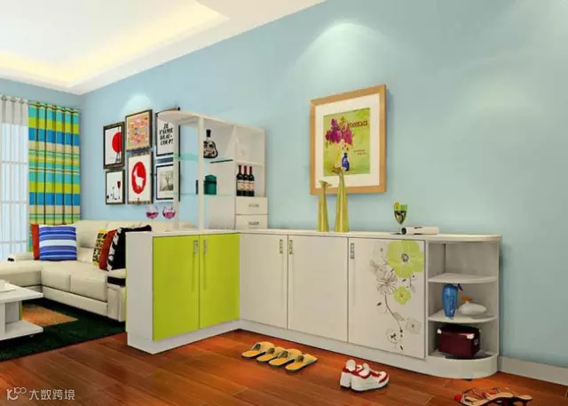 根据户型特点,在进门的左手边做了一个鞋柜与收纳柜的组合,整体感比较强,也非常的实用。旁边坐了一个镂空的隔断,既不会挡光,但改善了房间的风水问题,美观又实用。