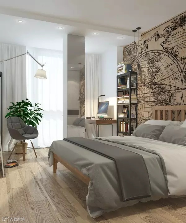 第一个案例是Elena Teplova为一对年轻夫妇设计的。这对年轻夫妇喜欢旅游,希望室内的装修能体现旅游文化。在这个面积为45㎡的房屋中,每一个角落都被设计得很紧扣主题。中性色调的设计,让房屋更有现代感,而同时这种中庸而沉稳的设计手法,近几年内都不会过时。