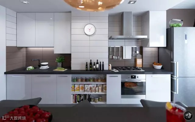 这个小型厨房再一次把垂直空间的优势高效发挥,让高出的空间也得以有效利用。