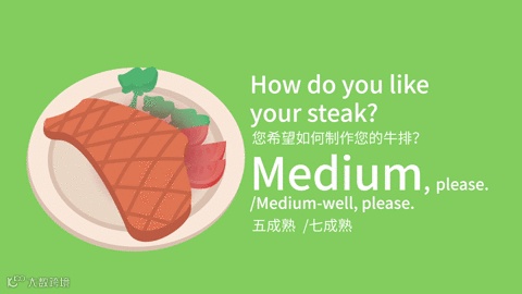 牛排steak是西餐厅的常见主食之一,通常客人喜欢点制作较嫩的牛排。您可以这么说: