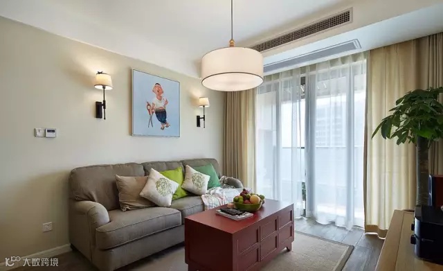 ▲ 布艺沙发美式风,红色茶几中式风,原木色电视柜