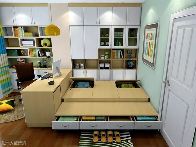 ▶ 摆上你可以是书房,可以是客房。靠墙的吊柜还能容下各种小物件,榻榻米可收纳换季衣物等,实用非它莫属。