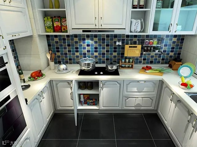 ▶ U型厨房,方正小空间的首选,开放式吊柜+地柜,超强大收纳功能,常用物品随用随取。