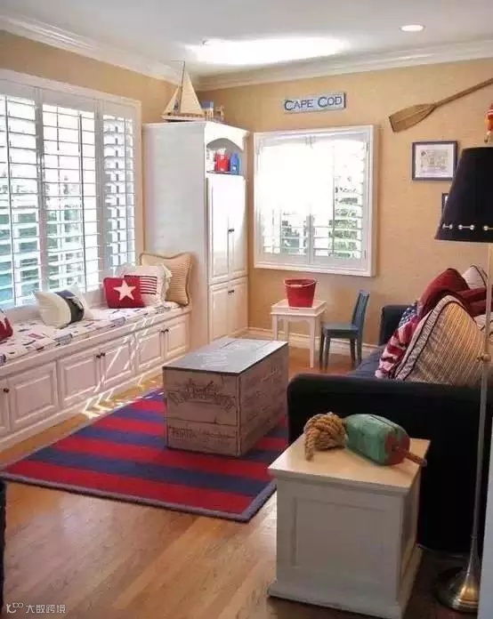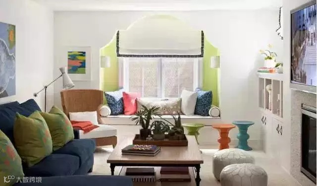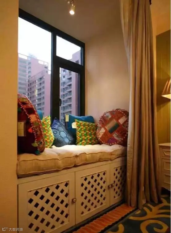 如果窗户底部没有墙体,面积又比较窄,保留原始形态的话有点浪费,所以就在底部设计收纳柜,再铺上彩色的小垫子,搭配小碎花的窗帘,就变成了一个充满浪漫氛围的小角落。