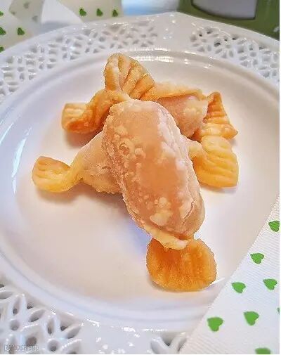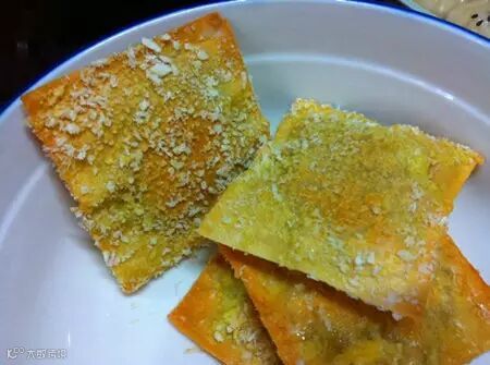 饺子皮50g、馄饨皮50g、油适量、椒盐适量、黄豆面适量、鸡蛋黄1个、面包糠适量、五香粉适量、白糖适量