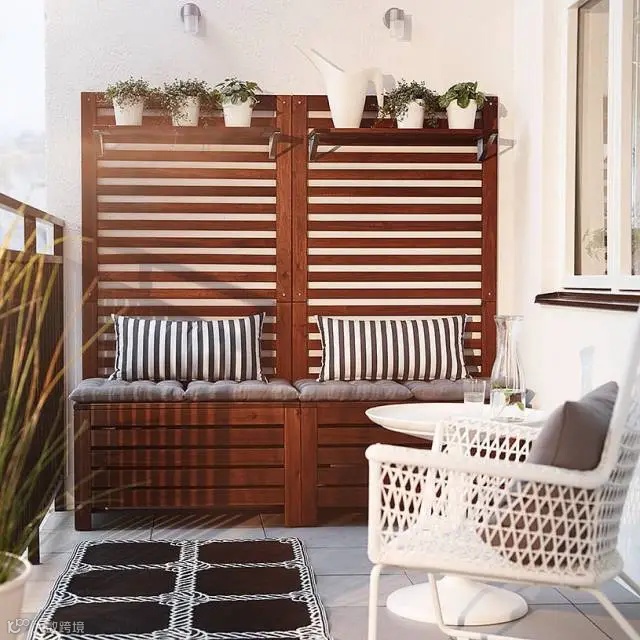 这款置物架同时还是户外座椅,感兴趣的朋友不妨去看看,如果座位底下是隐藏式的收纳空间,那么会让你的阳台变得更整齐哦,什么清洁剂、园艺工具之类杂七八糟的东西都可以放在里面。