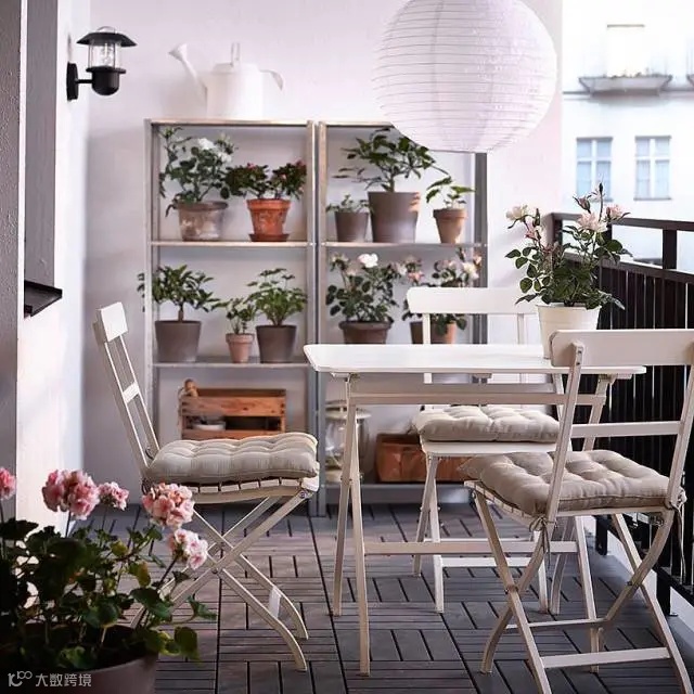如果你希望阳台走简约风或者是白色系,那么一定要注意了,因为首先空间已经不够大,再加上颜色和整体风格上也没有特别刺激视觉的,所以想要摆脱平平无奇,请一定要有足够的绿植装饰,而且花盆一定要符合阳台的整体效果。另外就是桌椅尽量选择设计上比较有特色的,最后加上北欧风的玻璃花瓶,烛台,和一两个颜色活泼的靠枕,效果立刻会得到提升。