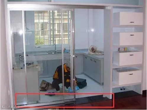 缺点:地面滑轨有一定的高度,家里有老人可能会绊脚(如下图);地面滑轨如果有脏东西可能会影响开关门的流程程度。