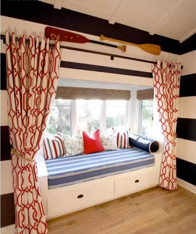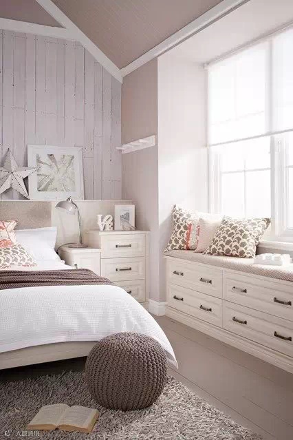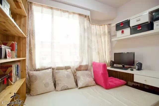 如果窗户底部没有墙体,面积又比较窄,保留原始形态的话有点浪费,所以就在底部设计收纳柜,再铺上彩色的小垫子,搭配小碎花的窗帘,就变成了一个充满浪漫氛围的小角落。