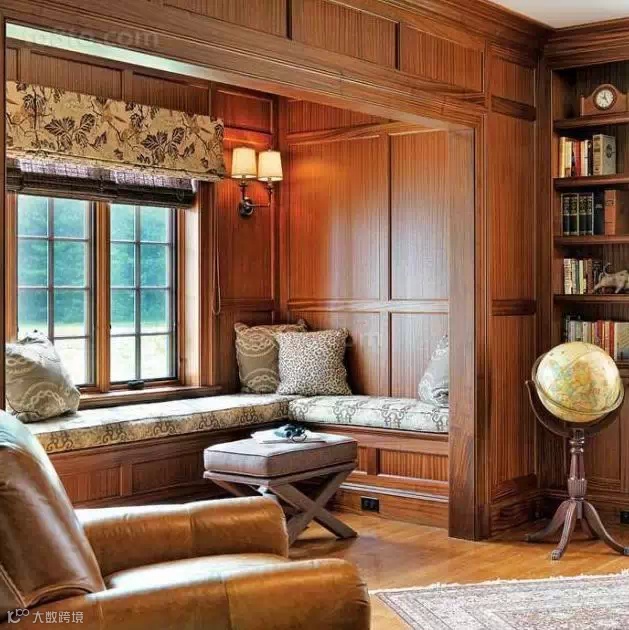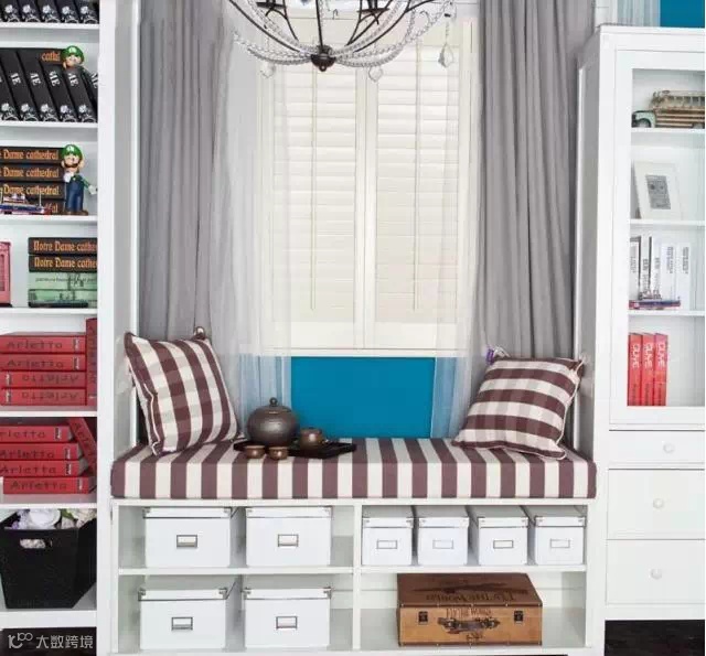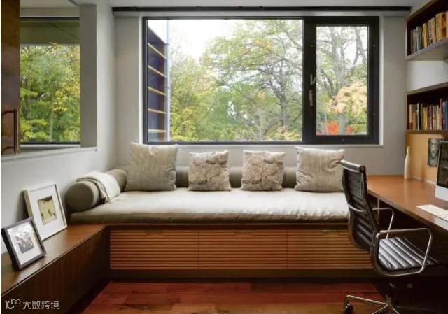 如果家中空间较小,而没有办法特地的空出一个地方设计成飘窗的话,不妨在满满的书架中掏出一个小小的飘窗吧。在这样的飘窗上读书想来肯定是件非常惬意的事情。