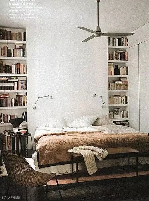 ▲对爱书人而言,还有什么比被书柜包围更能安心入睡?床边的层架也创造了一个温馨可爱的小角落。
