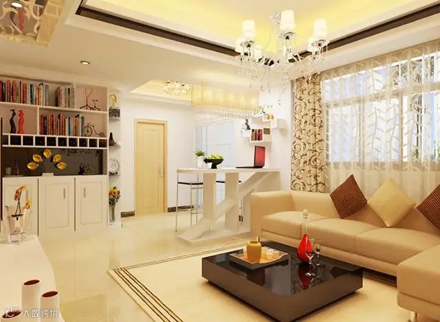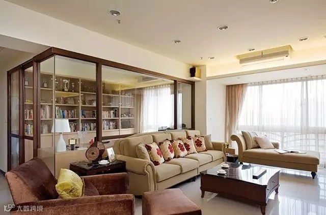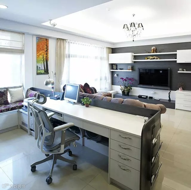 ▲如果客厅空间大的话,也可以尝试把书房放在客厅。利用长沙发进行空间上的隔断,实木长书桌和书架也可以提升客厅的档次。