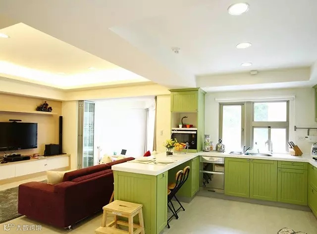 ▲厨柜本身就是最好的隔断,草绿色的厨柜搭配枣红色的沙发,可以尝试下~