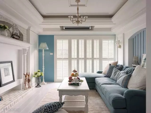 ▲蓝色沙发,蓝色墙壁,搭配白色百叶窗,浓浓的地中海风格,仿佛海风在你耳边拂过。