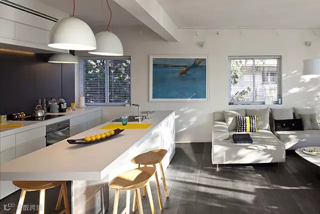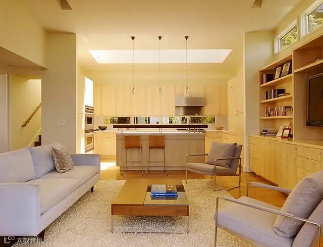 ▲利用开放式厨房的岛型操作台,将客厅和厨房区分开来。