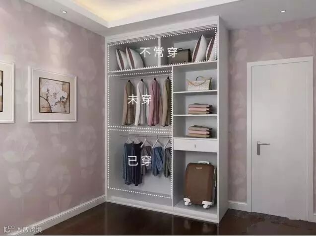 不同种类的衣物宜分区存放。每一件衣物都是独立的,材质不同,它们的护理也不同。这时候,聪明的太太就懂得对衣物进行分门别类的存放,即可合理分配衣柜内部空间,使衣柜容量最大化,又能在一定程度上对衣物起保养的作用。
