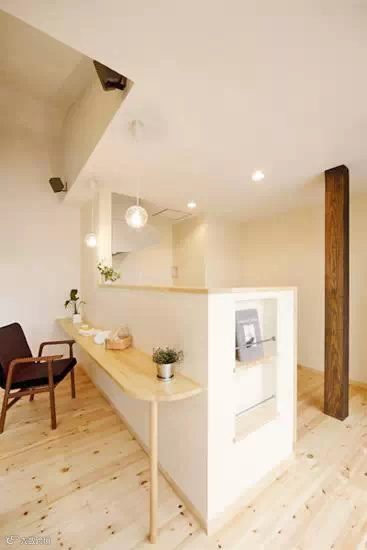 案例4:厨房区域的外围,木板打造了一个小小的就餐区。相连的厨房和小餐厅,方便拿取,一目了然。桌子边缘凹凸不平的样式,展现了原始的木板,非常有自然气息。