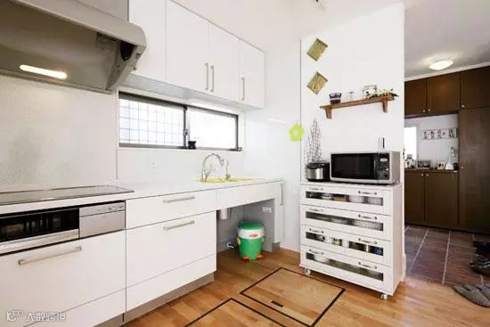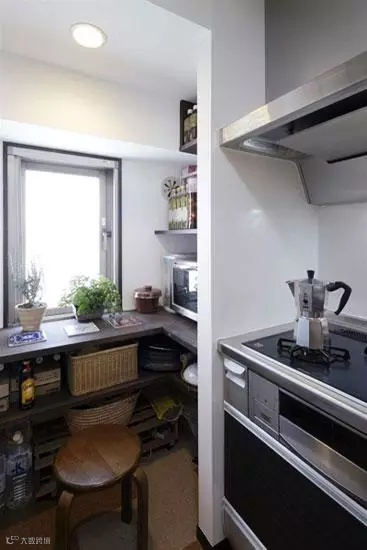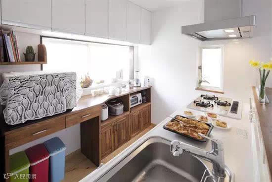 案例2:沿着窗户用木板打造一个收纳柜子,分层摆放上各种现代化的厨房用品,不仅简洁,而且将小空间的收纳性达到极致。白色网状的小布帘,镂空的样式,遮住了烤箱,可以避免灰尘弄脏烤箱,也给厨房增添了活泼可爱的气息。绿色、粉色、蓝色三个垃圾桶摆放在木质桌子底下,将垃圾分类,便捷的同时也给厨房增添了亮丽的色彩。