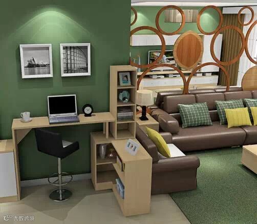 设计解析:没有书房,那就利用吧台书柜组合在别的空间挤出来一个,别致又实用。