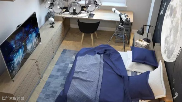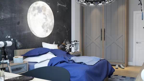 3 | 第三个房间的设计在年龄上是没有界限的,老少皆宜。住在屋里的占星师会在夜晚对着望眼镜观看遥远的星光,床头明亮的月增添了房间的舒适度。