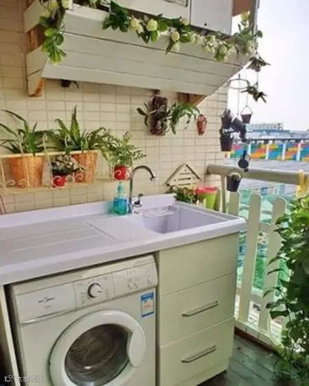 阳台上的绿色是整个空间的亮点。在设计洗衣机的时候一定要注意起后续事项。下水处理起来比较麻烦,若楼层不高的话,可以在阳台外按一根pvc管直通地面。