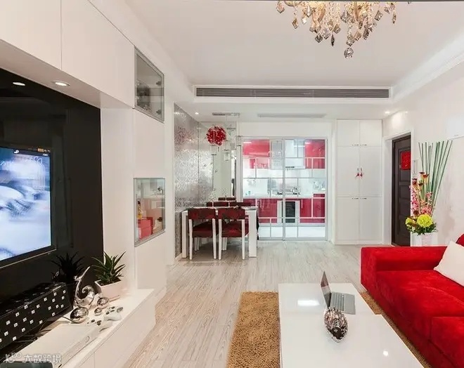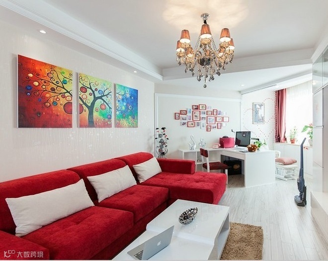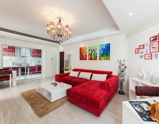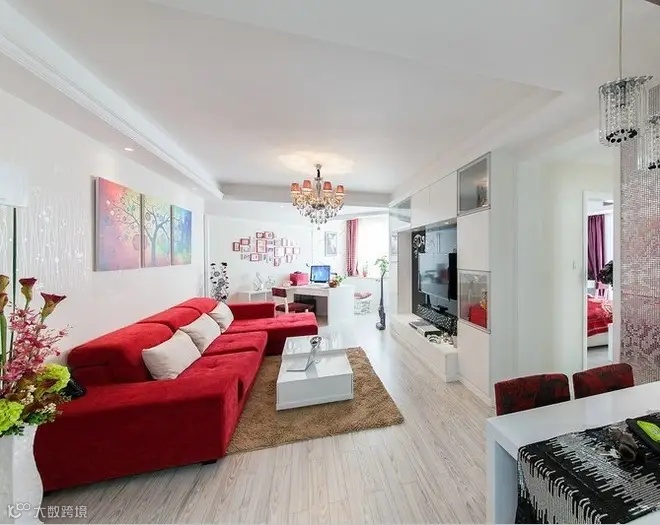 客厅的整体效果,白色与红色的撞,真是婚纱的白色与中国风的红色,绝美搭配。