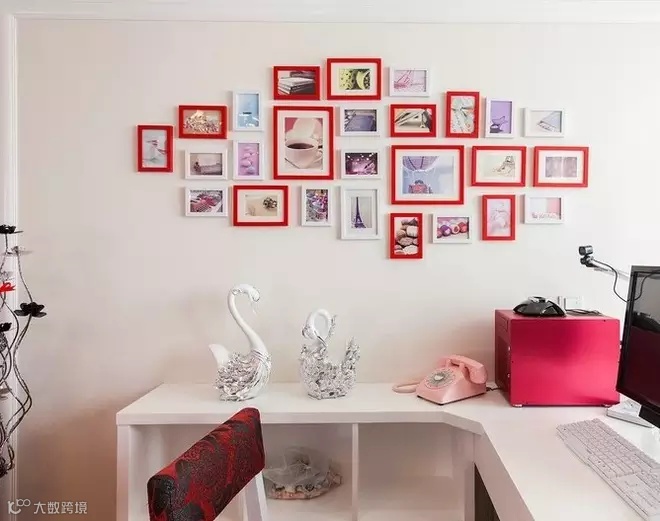 电脑桌的装饰品也不少哈,喜庆的照片墙做背景。