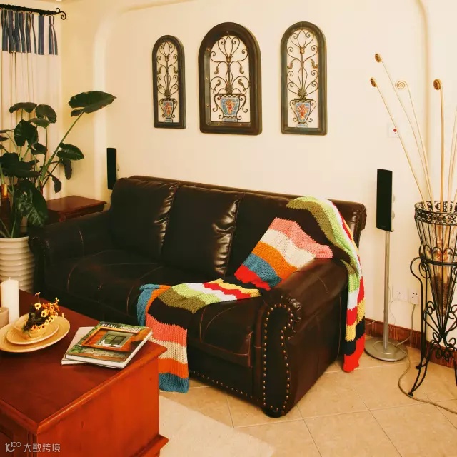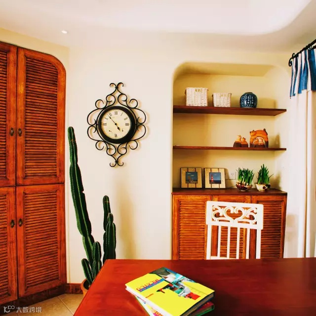 金属铁艺的挂钟和吊灯,木质的镂空条纹柜门,连书房中也处处飘散着地中海的气息。
