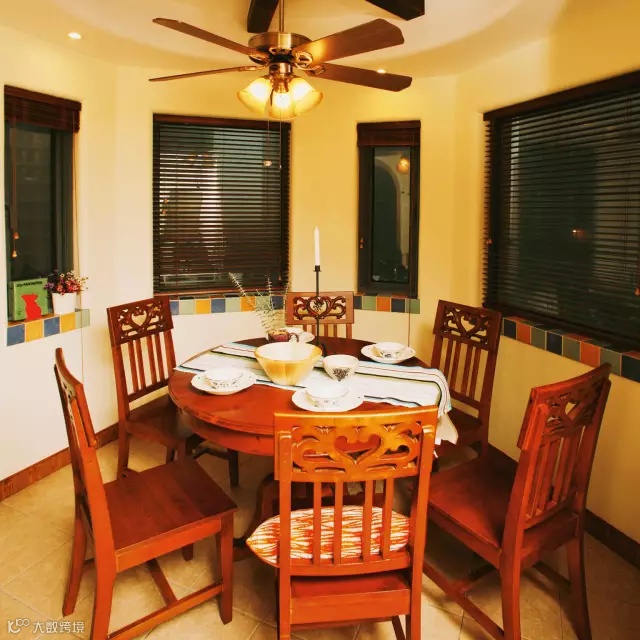 圆形的吊顶和圆桌上下呼应,碳烤风扇形的木梁与扇形吊灯相互配合,百叶窗和拼色的窗台,都显得餐厅别具一格。