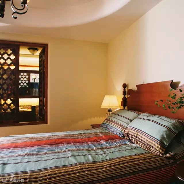 主卧中的四角柱形实木床更显沉稳,花样造型的碳烤木窗却为卧室更增添了一丝韵味。