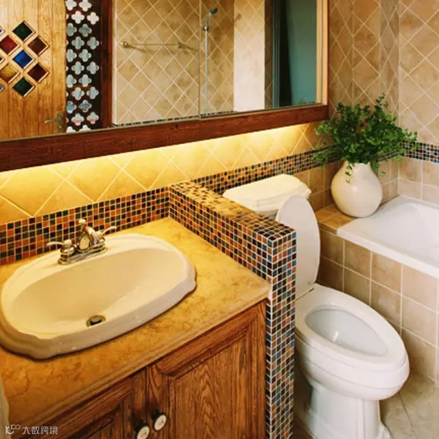 马赛克地台,倒圆角造型装饰门洞,墙上的贴花及壁龛,处处洋溢着地中海的味道。