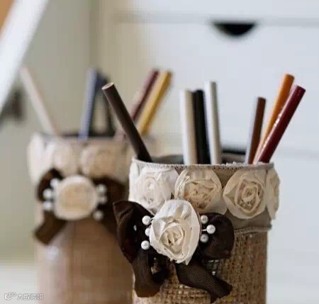 在外面包一块布,加点花花,就成了漂亮的柱形笔筒了!