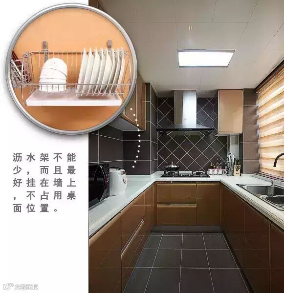厨房要有足够的台面操作空间。沥水架不能少,而且最好挂在墙上,不占用桌面位置。