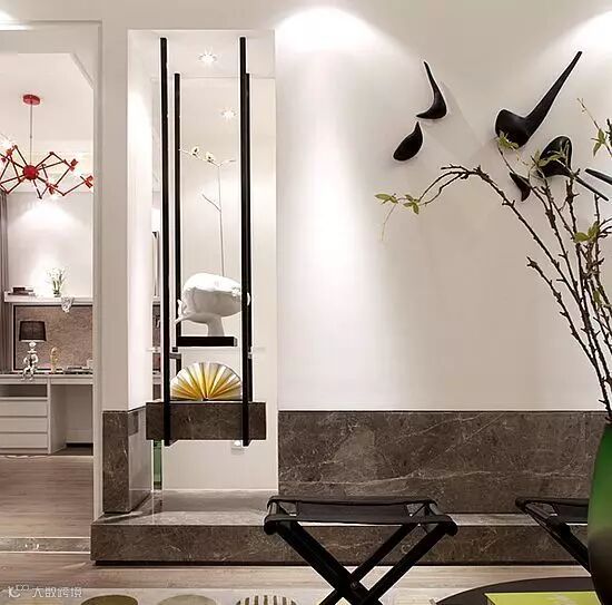 茶几是折叠式的,家里如果举办party就可以随时挪动。墙面上的鸟儿与绿植相配,更加生动形象。电视背景墙旁边还做了个长条形的展架,折纸扇和雕塑,格调尽显。