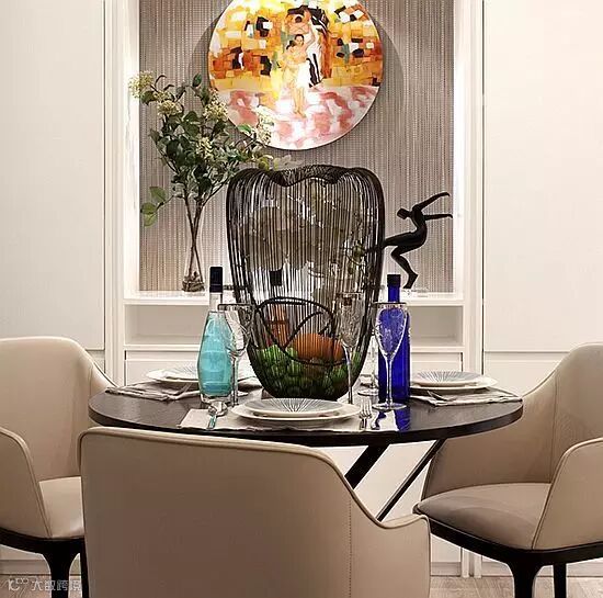 圆形的餐桌设计,适合单身或者小两口的日常生活,桌上放置的鸟笼形工艺品别有一番意义,笼子上是一个人,一只脚已经陷进笼子里,表达了业主人的某种情绪。