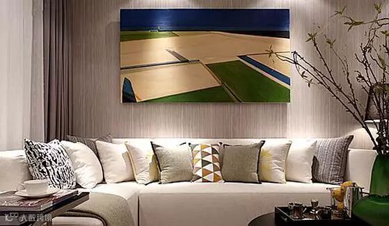 客厅全景图,沙发背景墙采用了三维板设计,黄色、绿色与蓝色的色块设计为简白空间增添了色彩。原本的电视背景墙被粘上了飞鸟的工艺品,像一群鸟儿翱翔在白色天空里,生机勃勃。