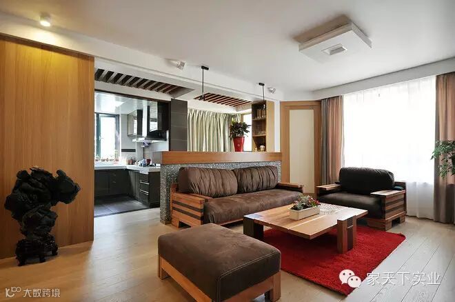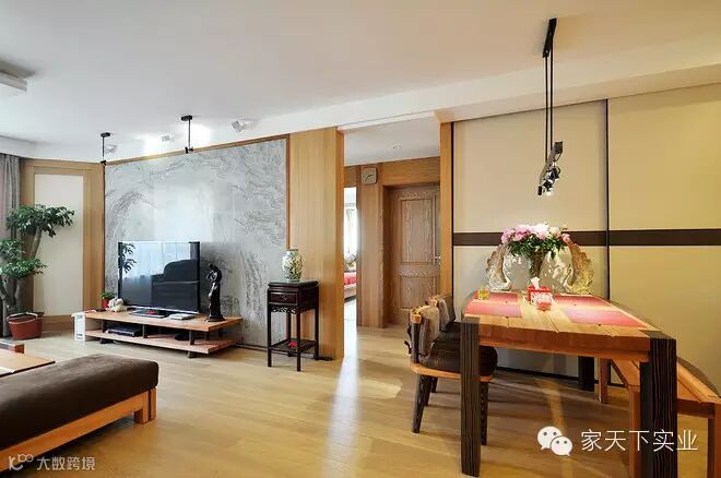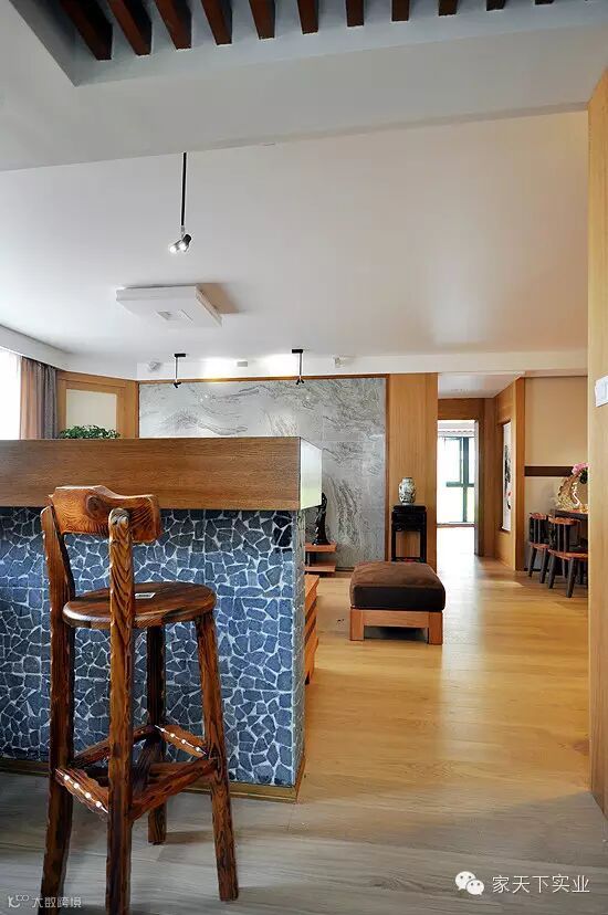 客厅背景墙一改以往布置单调的习惯,代之以一快大理石墙砖,恰似一幅山水艺术画,在木色背景中显得更加突出。摒去了机械带来的聒噪,换之以艺术的宁静,是业主独特的品味的表现。