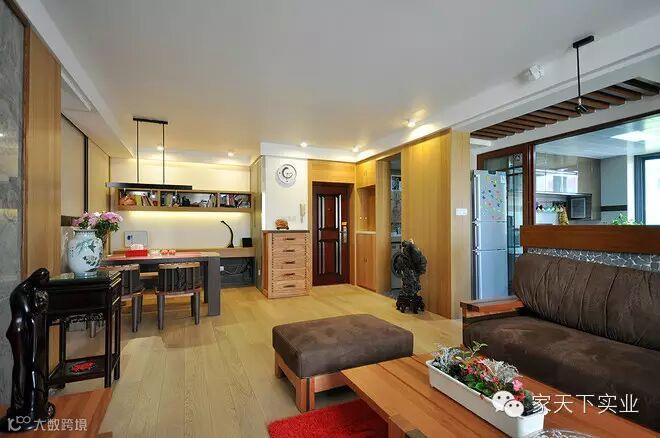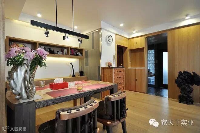 开放式的主场域,将客厅、餐厅跟阅读区结合在一起,由原木质地的地板连接在一起,衬托出一种艺术的气息。