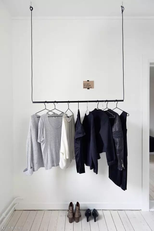 2、固定式衣架:一根长杆,固定于墙上或棚顶,节省地面空间。有的需要按照墙宽来定制。