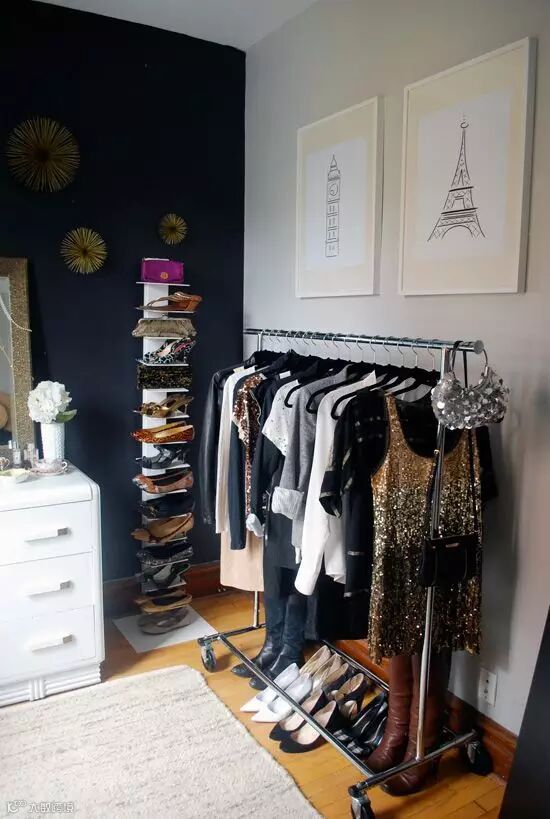 在衣柜旁靠墙安置,上面的搁板、下面的储物筐,是衣架的绝佳搭配。