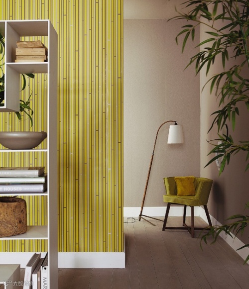 玄关:过渡区域要好好打造:黄绿色竹纹壁纸,入口处的转角空间充分利用起来,放置一把木质座椅和一个落地灯,实用之外更吸睛。