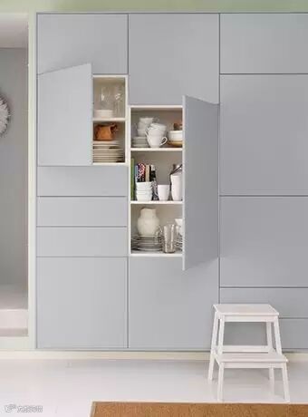 同样是顶天立地的大柜子,如果我们退而求其次,不使用整体门板,而是采用开合独立的小块门板拼接而成,并把衔接的缝隙做到最小,使表面依然保持齐平。不必使用那么高的门板,这样就能节省将近一半的成本。