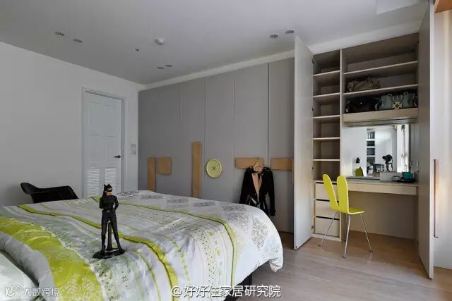 虽然没有做到顶天立地,但是门板很高,而且隐藏化妆台分区很值得借鉴;另外,柜子里较暗,注意灯光的布置。