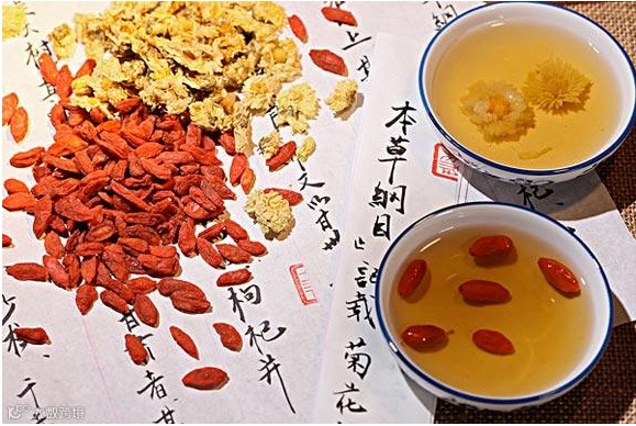 枸杞菊花茶是用菊花和枸杞同泡而成。每次用杭白菊、枸杞各10克加入大茶壶内,加入热开水,10分钟后便可饮用.枸杞对于养精益气,温热滋补有很强的功效。