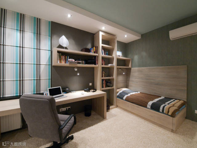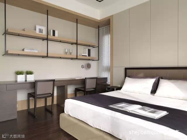 主卧里除了摆放床意外,其实可以利用墙面收纳完全可以挤一出部分做书桌。休闲办公完全可以兼得。