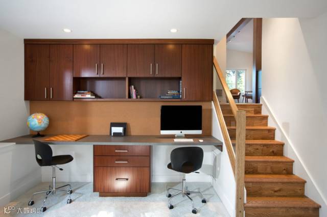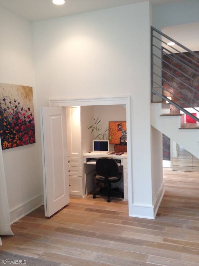 复式楼的小伙伴们注意了,楼梯下的空间用来做收纳是没有问题的。那如果在保证收纳的同时还能挤出间开放式书房不是更好嘛!看图!