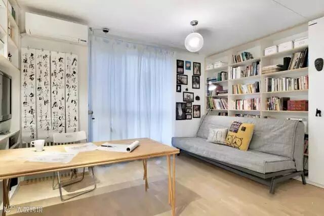当把格子打开,拉出帘子,打开折叠的沙发,客人就可以在这里看电视休息了。有时男主人也会因为呼噜声可怜的被女主人撵到这里思过。当然这里也是一个绝佳的读书和看电影的角落。