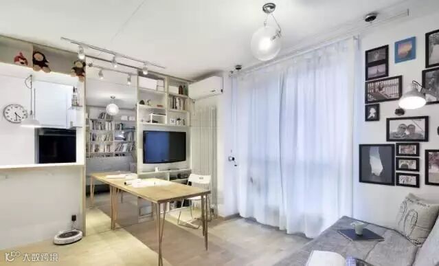 接下来看看客厅吧。女主人的衣柜必然是堂而皇之的侵占到了客厅,否则哪里安得下。通高的镜子装在了冰箱的背后。储物墙的好处不必多言,它也正是这次改造的一大功臣。
