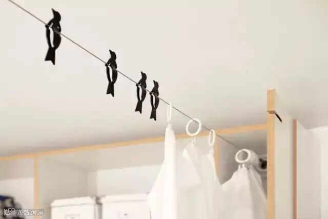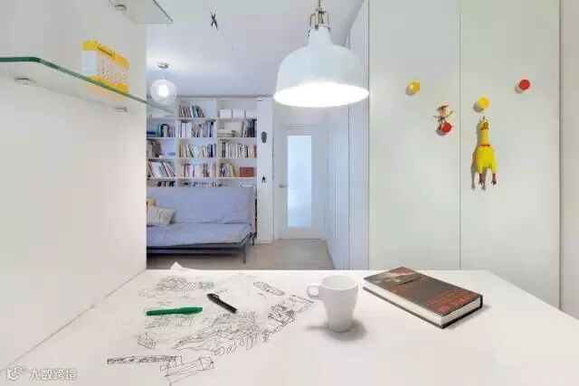 客厅除了满足平常的生活之余,还要考虑偶尔朋友或家人过来临时住宿的功能。所以在客厅中央的顶部有一根钢丝线,上面还站着几只主人从米兰带回来的小鸟夹子。不知道的朋友还好奇这是做什么用的,实际上在图中这个书架右侧内暗藏着一个格子。